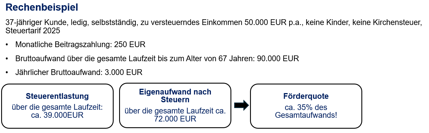 Die Beiträge zur Basisrente sind vollständig als Sonderausgaben absetzbar – also zu 100 %. Dadurch profitieren Sparer:innen von einer attraktiven staatlichen Förderung: Denn ein Teil der Einzahlung fließt über die Steuererstattung vom Finanzamt zurück und steht zur freien Verfügung.