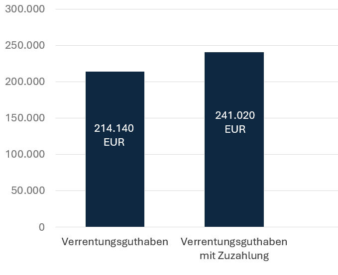 Und auch die einmalige Zuzahlung von 5.000 Euro kann wie die laufende Investition steuerlich voll abgesetzt werden. Das heißt, Sie zahlen nach Steuern effektiv nur 2.900 Euro.
